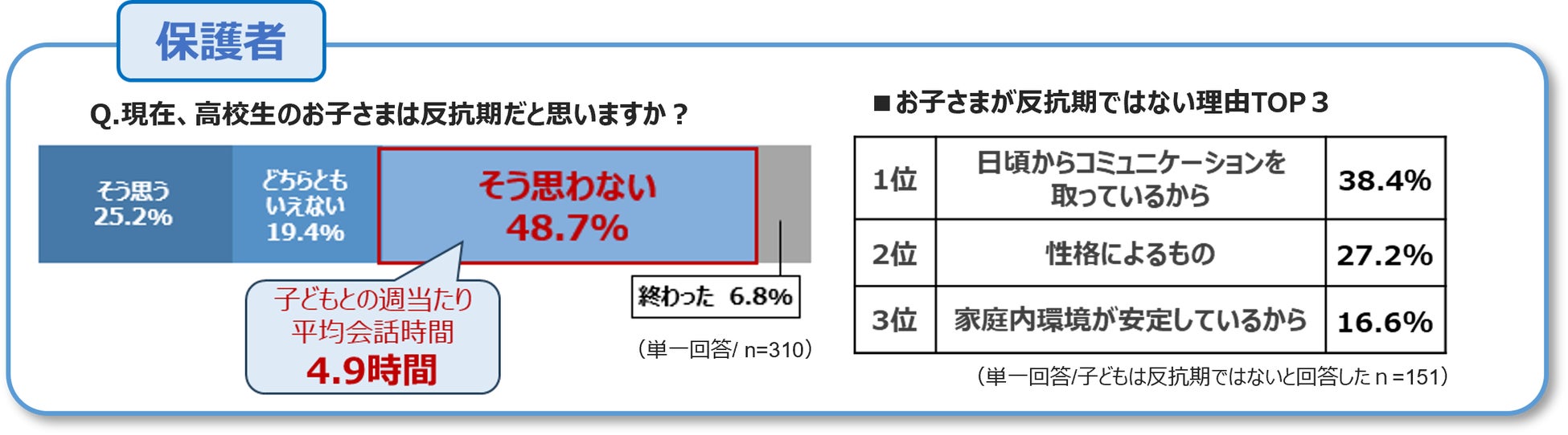 身体的な成長や精神的な変化も大きな高校生の反抗期について、保護者と高校生にアンケートしました。まず、保護者に「現在、お子さまは反抗期だと思いますか?」と聞くと、48.7%が「そう思わない」と回答。その理由は、「日頃からコミュニケーションを取っているから」が1位の結果となりました。なお、反抗期ではないと回答した保護者に聞いた週当たりの高校生の子どもとの平均会話時間は4.9時間でした。高校生にも「自分は反抗期だと思いますか?」と聞くと、33.2%が「そう思わない」とし、その理由は「保護者や先生など、反抗するどころか尊敬している・好き」が1位に。