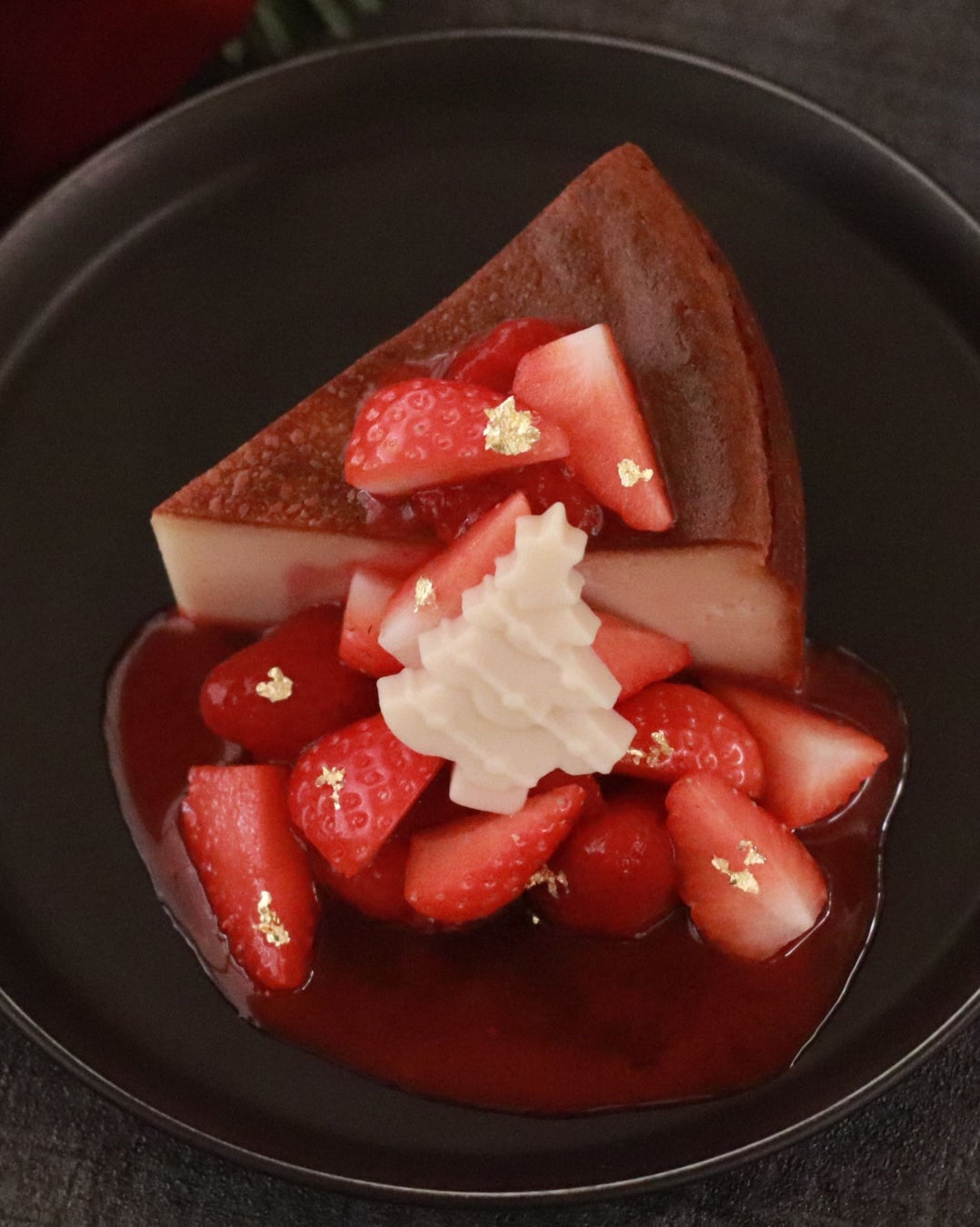 有機豆乳を主成分として、植物性とは思えないクリーミーさとなめらかな舌触り、食後の軽さが嬉しい特別なヴィーガンベイクドチーズケーキを、赤色鮮やかなホリデーバージョンでご提供します。