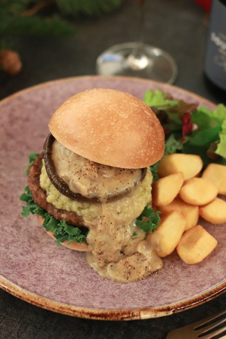 店舗限定・ウィンターホリデーメニュー限定で登場するのは、うまみを逃がさないよう、オーブンでじっくり火を入れたジャンボマッシュルームが主役の贅沢なバーガーです。