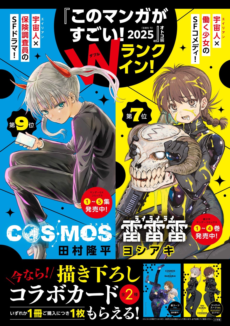 『このマンガがすごい!2025』オトコ編(宝島社刊)にランクインした最旬SF漫画の神コラボが実現!!貧乏少女が宇宙人に攫われたことで運命が変わるSFコメディ『雷雷雷』(ヨシアキ/コミックアプリ「マンガワン」連載中)最新第4巻と、宇宙人専門の保険調査員によるSFヒューマンドラマ『COSMOS』(田村隆平/「月刊サンデーGX」連載中)最新第5集が1月17日(金) 同時発売! これを記念して、『雷雷雷』『COSMOS』のコラボノベルティフェアを全国の対象書店で順次開催致します。