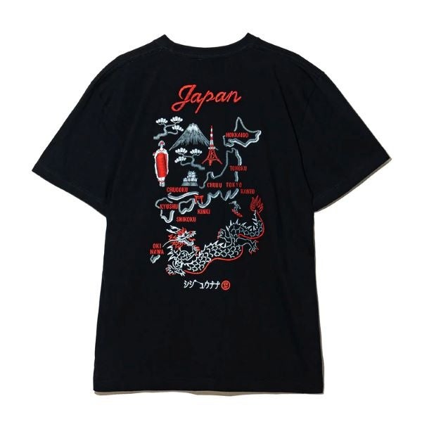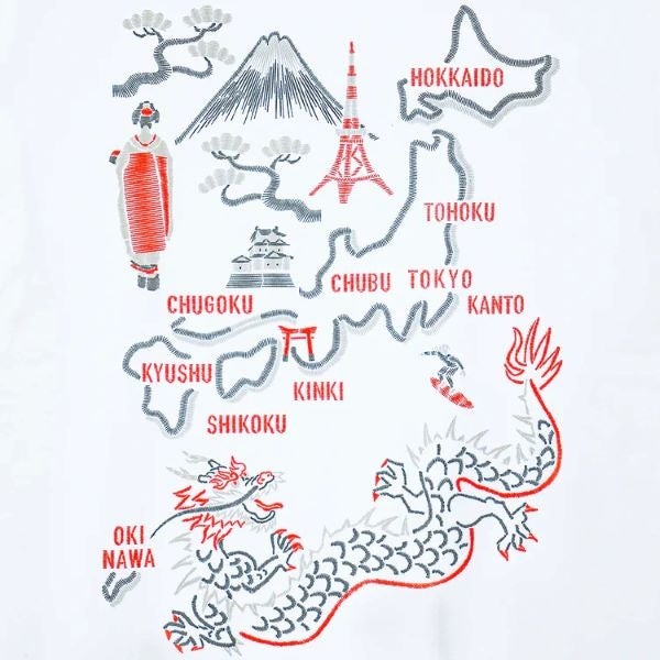 『JAPAN』柄!シジュウナのメインカラーである朱赤をポイントにグレーの濃淡で仕上げたデザインは、本物の刺繡のような立体感のあるプリントが特徴。華やかながらもスタイリッシュな一着です。