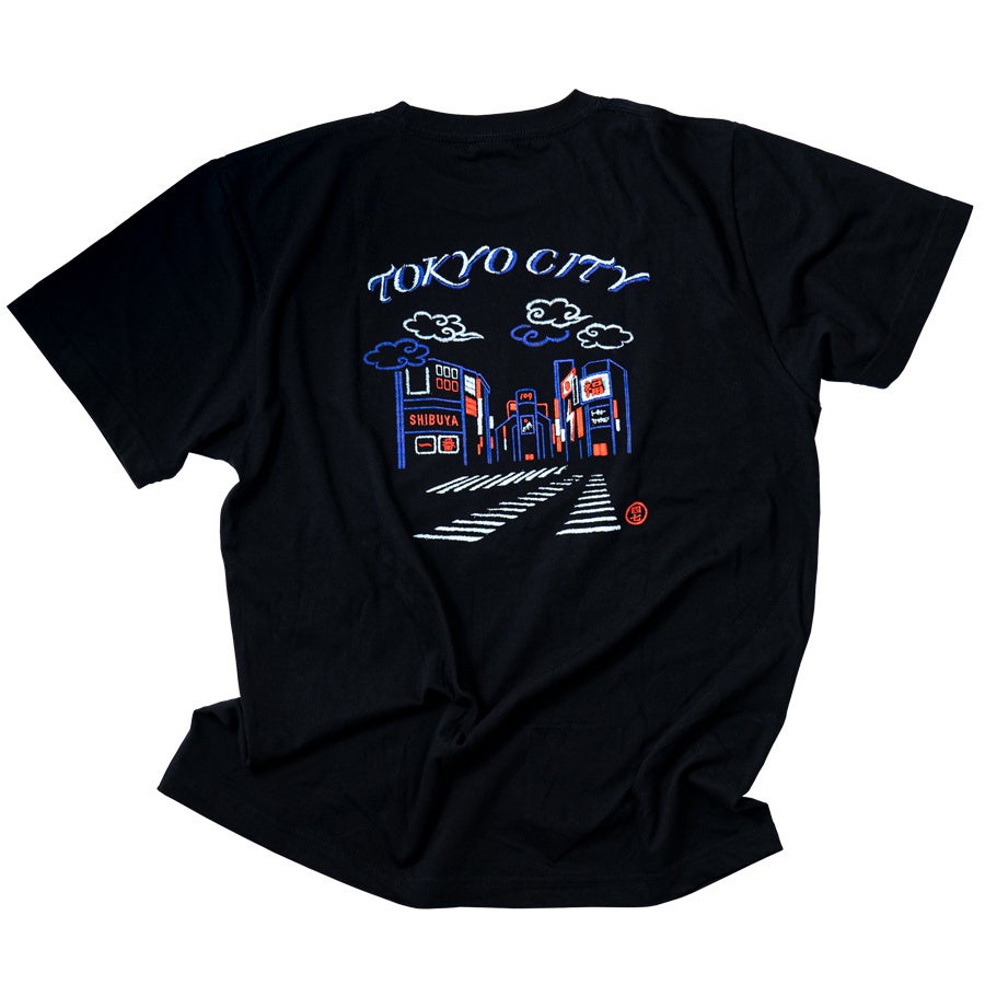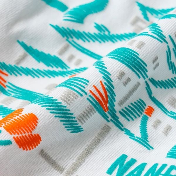 シジュウナナでは、刺繍の糸を用いて縫う技法を「一本一本の糸を線で描く」ことで表現し、特殊加工によってまるで刺繍のような質感のTシャツに仕上げています。