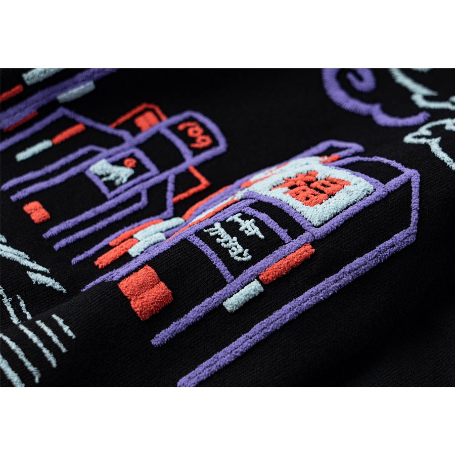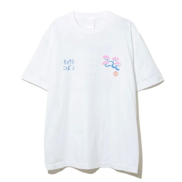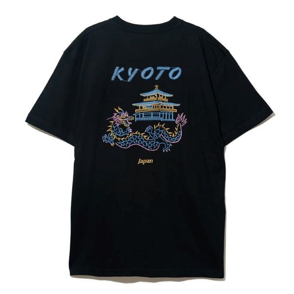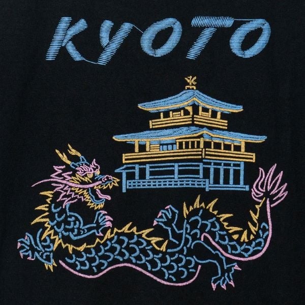 フロントにはキュートな“キョウトニッポン”のカナロゴとポップな松のスカジャン風のプリント、背中の金閣寺と龍が金運を運んでくれるかも。これ着て、神社仏閣を回ってみてください。