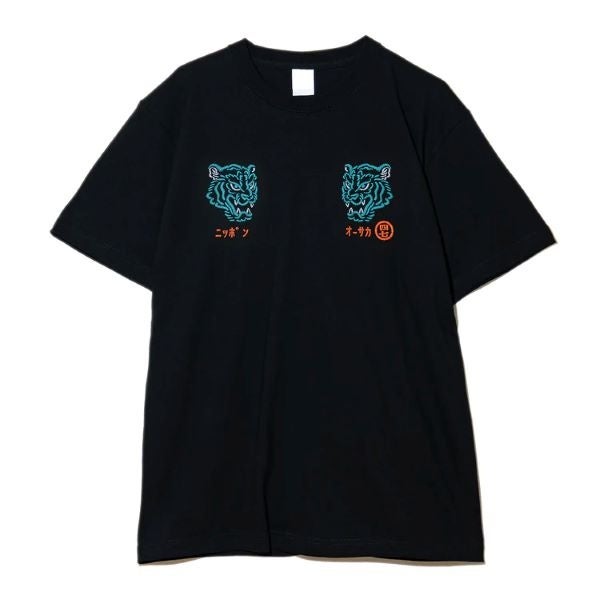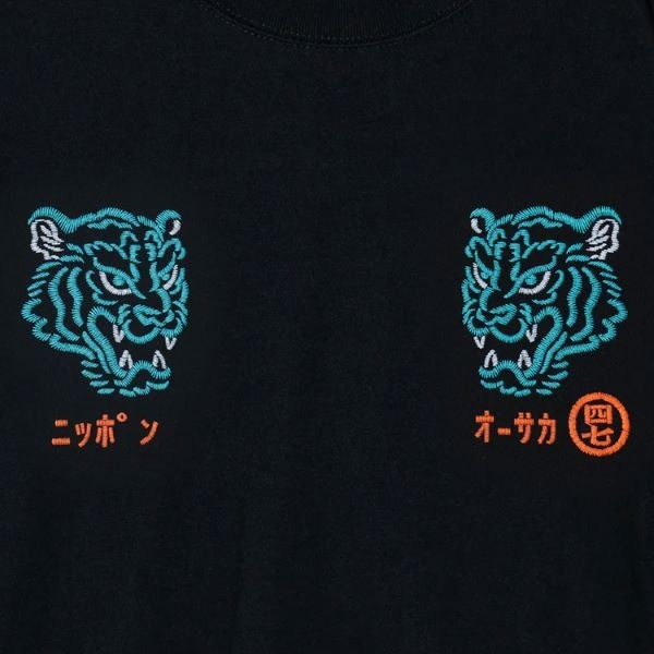 フロントの両胸には虎の顔と「オーサカ」の文字、シジュウナナ印をあしらいスカジャン風に。バックのデザインは、大阪府のMAPとシンボルである大阪城をネオングリーン×オレンジの元気カラーで表現しています。