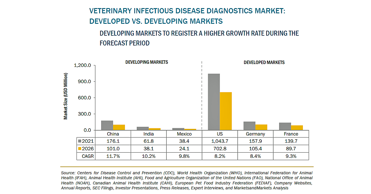動物用感染症診断の市場規模は、2021年の17億米ドルからCAGR9.0%で成長し、2026年には26億米ドルに達すると予測されています。これは、コンパニオンアニマル数の増加、越境感染や人獣共通感染症の増加、動物由来の食品需要の増加、ペット保険需要の増加、動物医療費の増加、先進国における獣医師数や所得水準の向上などが主な要因と考えられます。一方で、ペットケアコストの上昇が市場全体の成長を抑制すると予想されます。現在、特に発展途上国においては、熟練した獣医師や診断インフラが不足していることが、高度な診断ソリューションの導入を制限する大きな要因の一つとなっています。また、診断検査の高コストも、普及の大きな障壁となっています。