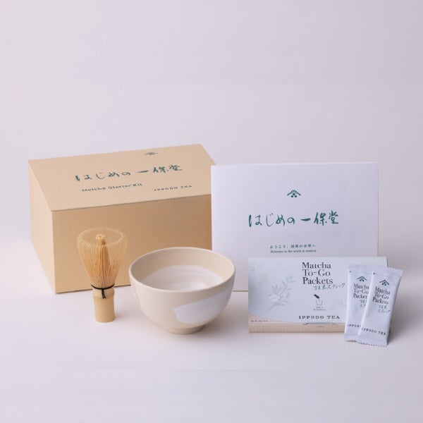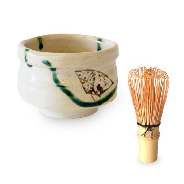 キットの中身は、抹茶茶碗・茶筌・抹茶スティック。お湯さえ用意すれば抹茶が点てられます。抹茶の点て方や楽しみ方、道具の扱いが書かれた日/英併記の栞付きです。
