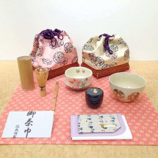 抹茶を気軽に楽しんで頂けるように小ぶりの茶道具を雅やかな籠にセットしました。