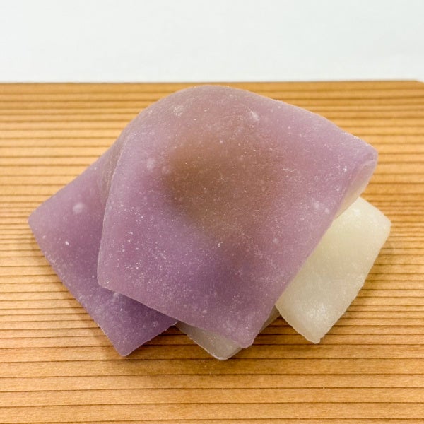 「からころも きつつなれにし つましあれば はるばるきぬる たびをしぞおもふ」それぞれの句頭に、『か・き・つ・は(ば)・た』の五文字を折り込んだ六歌仙の一人、在原業平の詠んだ有名な和歌を、薄紫の外郎で白あんを包みカキツバタの花で表現してます。