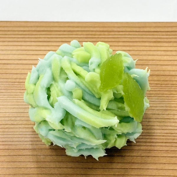 初夏の頃、青葉を吹いて渡る東からの風を、緑色・水色の二色の薯蕷きんとん生地と青葉型の羊羹で表現してます。