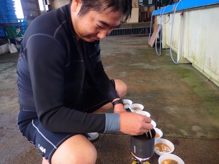 測定が終盤に差し掛かるころ、冷えた生徒たちの体を温めてあげようと、先生がお味噌汁を用意して下さいました。また、古田事務局長から炊き立てのご飯の提供があり、ウニとうずらの丼を作りました。5合あったご飯はあっという間になくなり、最後は、全員で記念撮影を行い、今後の研究成果の発表に向けて気合を入れました。