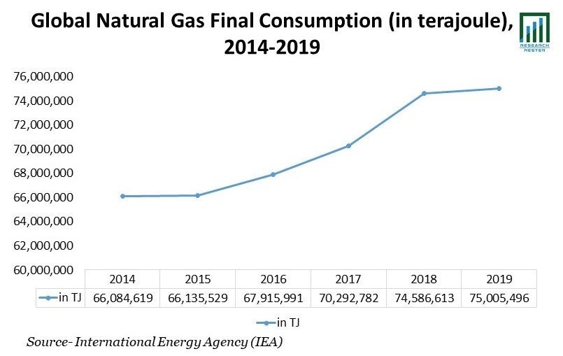 さらに、天然ガスの世界的な消費の増加は、全体的な市場の成長を後押しすると予測されています。IEAのデータによると、2019年には76,005,496テラジュールの天然ガスが消費され、2014年の66,084,619TJから増加しました。