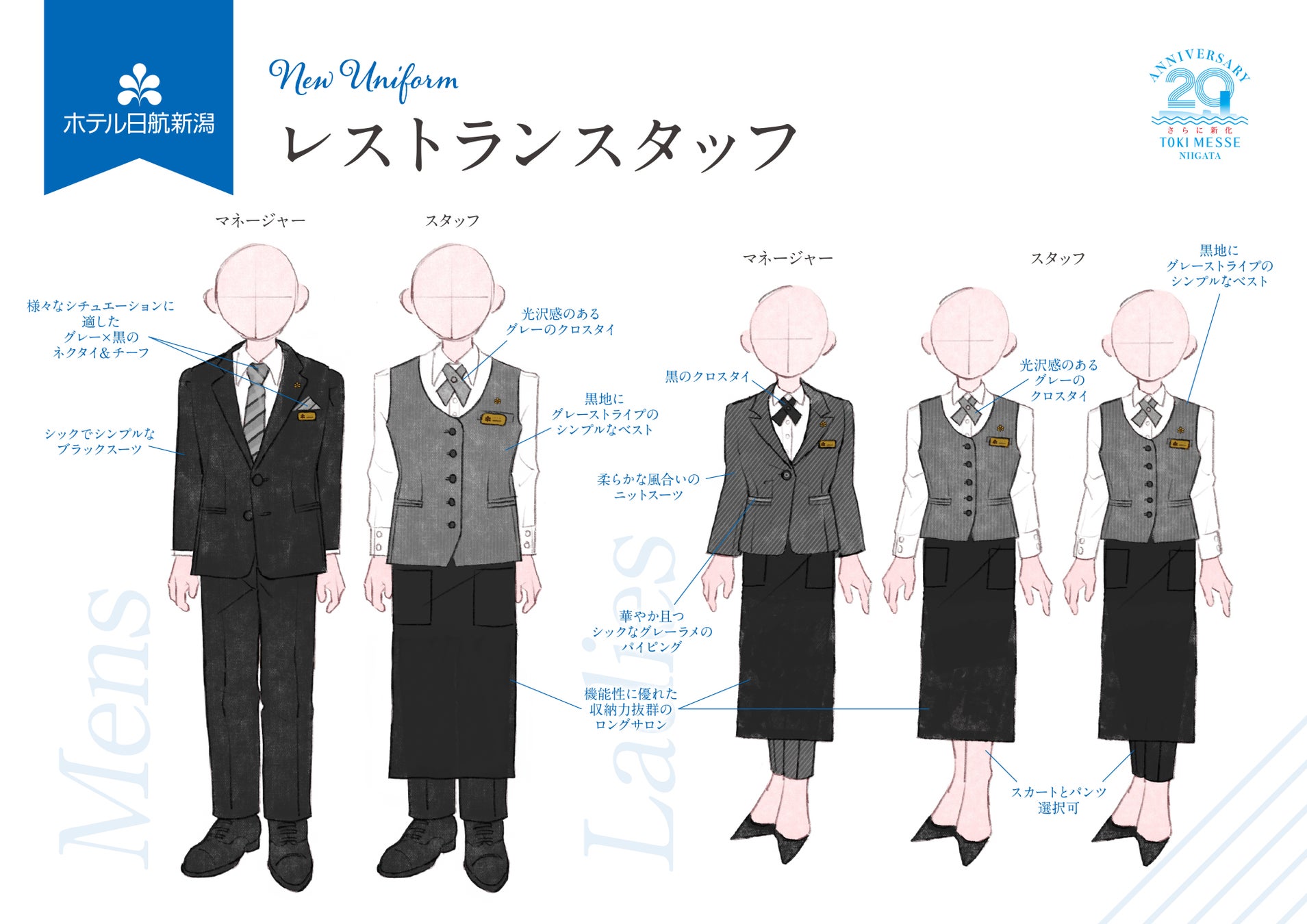 フロントスタッフやレストランスタッフが着用するメインコスチュームは黒を基調とし、シンプル&スタイリッシュなデザインを選びました。さらに、多様性・機能性を重視し、女性もスカートかパンツスタイルか個人で選べる形にいたしました。