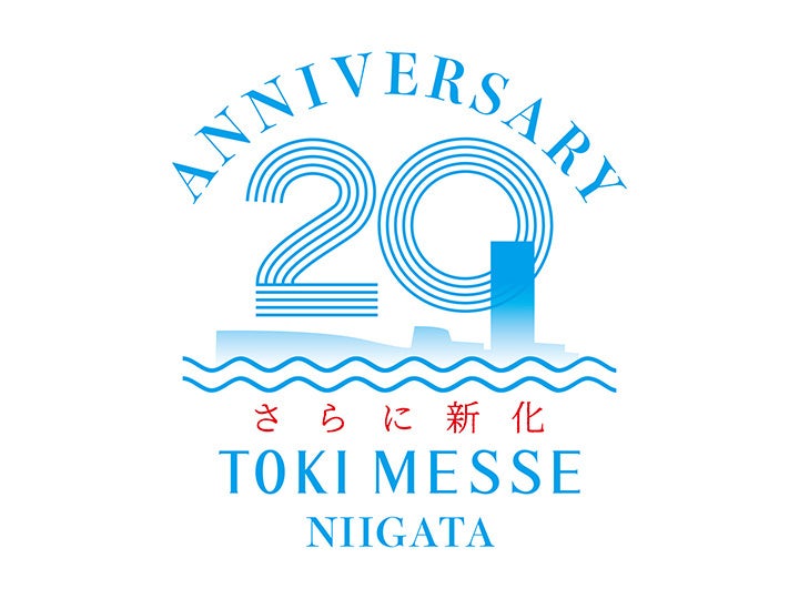 記念ロゴは、新潟市中央区にある「新潟デザイン専門学校」の学生の皆様が20周年を迎える当施設の想いを形にしたものです。縁起の良い水引をイメージした「20」の文字からは祝福を、清涼感あふれる水色の建物のシルエットは、信濃川沿いに建ち「さらに新化」を目指す姿が堂々と表現されています。