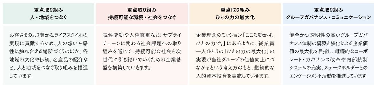 三越伊勢丹グループは、事業活動を通じて社会課題の解決に寄与しながら、持続的に企業価値を高めていくことを目指し、サステナビリティ経営の強化に努めています。サステナビリティ経営においては、目指す姿の実現に向け4つの重点取り組み(マテリアリティ)を定め、これらの取り組みを各事業戦略と一体となり推進しています。