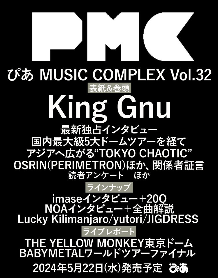 5/22発売『PMC Vol.32』、予約好調につき初版部数増! 表紙・大特集King Gnu、OSRINら関係者証言ほか