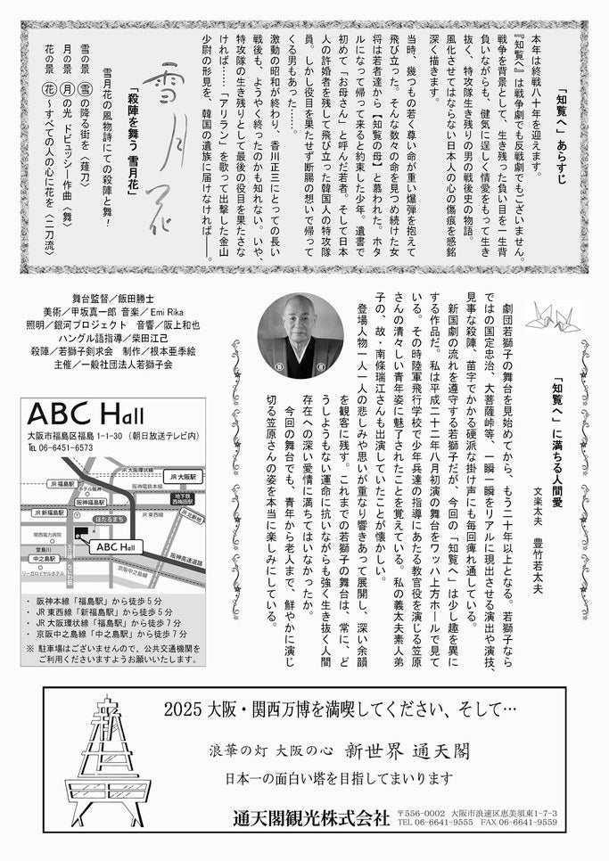 昭和100年、終戦80年祈念公演 若獅子会「知覧へ」「殺陣を舞う 雪月花」大阪・ABCホールにて上演決定