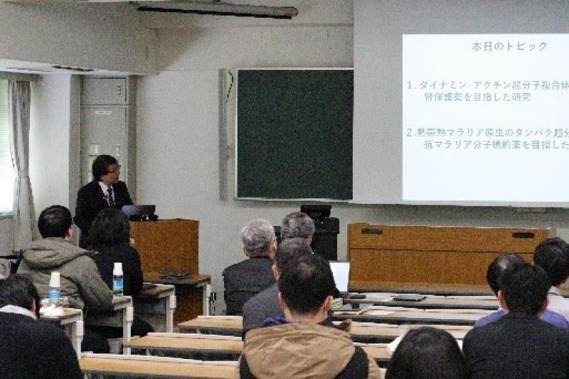 その後、クライオ電子顕微鏡を活用して革新的な研究開発を行う産学の研究者5人の研究者が講演。名古屋大学大学院理学研究科の成田哲博准教授は「クライオ電子顕微鏡法の立ち位置とその可能性」について、九州大学生体防御医学研究所の渡部聡准教授は「亜鉛を介したタンパク質品質管理機構の分子基盤」について、東北大学大学院生命科学研究科の横山武司助教は「The DARC method、無細胞翻訳系の直接観察による分子夾雑環境下のリボソームの可視化」について、塩野義製薬株式会社創薬化学研究所の陳正豪研究員は「製薬企業におけるクライオ電子顕微鏡の活用と未来」について、本学学術研究院医歯薬学域の山田浩司研究教授は「新規タンパク質超分子複合体の解析から紐解く創薬展開の可能性」について、それぞれ講演。その後の質疑応答では、活発な意見交換が行われ、クライオ電子顕微鏡などの最新の研究機器等の戦略的な整備や運用についても議論がなされました。