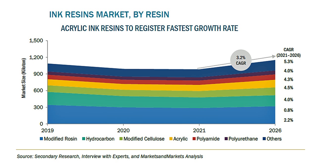 インク樹脂の市場規模は、2021年の33億米ドルからCAGR3.4%で成長し、2026年には38億米ドルに達すると予測されています。印刷インキ業界の環境保護基準の高まり、パッケージやエネルギー硬化型インキ業界の成長、UV硬化型インキの需要増加、新しい樹脂技術などが、インク樹脂市場の成長の主な要因です。