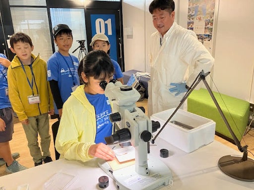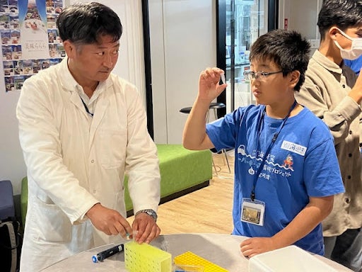 MaOI機構には研究施設(ラボ)が備えられています。キッズたちも研究の一環として、サクラエビの顕微鏡観察とDNAの抽出にチャレンジしました。まずは、実際にサクラエビの重さを図り、顕微鏡でオスとメスをチェック! オスとメスでどういう傾向があるのか、キッズたちで考えました。 また、自身の目で見る機会のない「DNA」を抽出してみました。サクラエビの組織の一部を薬液に浸すと、モヤモヤとした塊が見えてきました。これがサクラエビのDNAです。体験の後は、それぞれが進めている研究内容について、今後どんなリサーチをしたらよいのか、MaOI研究員の皆さんに質問タイム。 調査の進め方、仮説の立て方、どんな方にアドバイスを求めたらよいのか、などこれからの研究発表に向けて、具体的な質問がたくさん寄せられました。