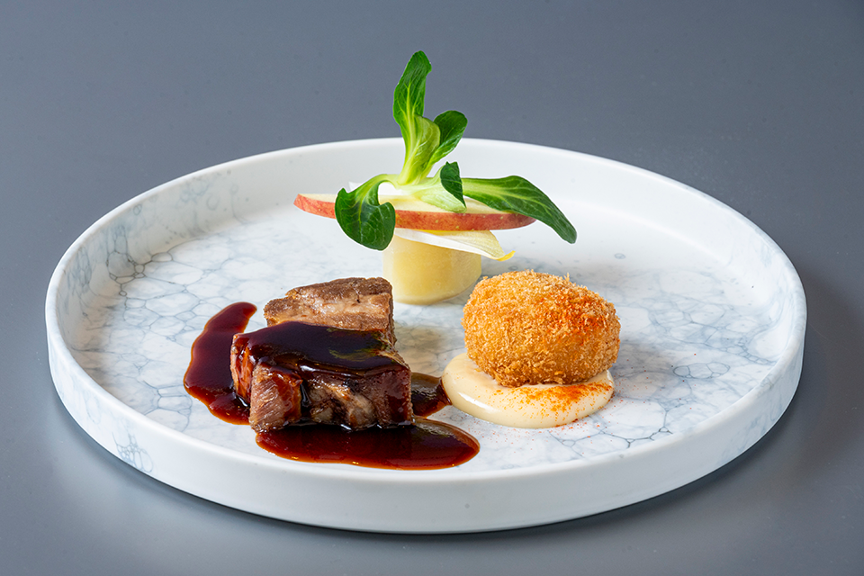 コースの前菜は「讃岐タコ」を使用。讃岐タコはエビやカニなど栄養豊富な餌を食べて育つため、他の地域で獲れるものと比べて足が太く引き締まっているのが特徴です。歯ごたえのあるタコのマリネを、口全体に広がる爽やかな甘みが魅力のアスパラガス「さぬきのめざめ」と共にサラダ仕立てにしました。メインには県花・県木のオリーブを餌に混ぜて育てた「オリーブ豚」を使用。保水力が高く、肉汁を豊富に含んだオリーブ豚を90℃のラード油で4時間煮込み、柔らかく仕上げました。スパイスを効かせた赤ワインソースと共にお召し上がりください。その他にも、「小豆島産鱧」や「香川県産キウイ」など、香川の食材をふんだんに使用した料理が登場いたします。