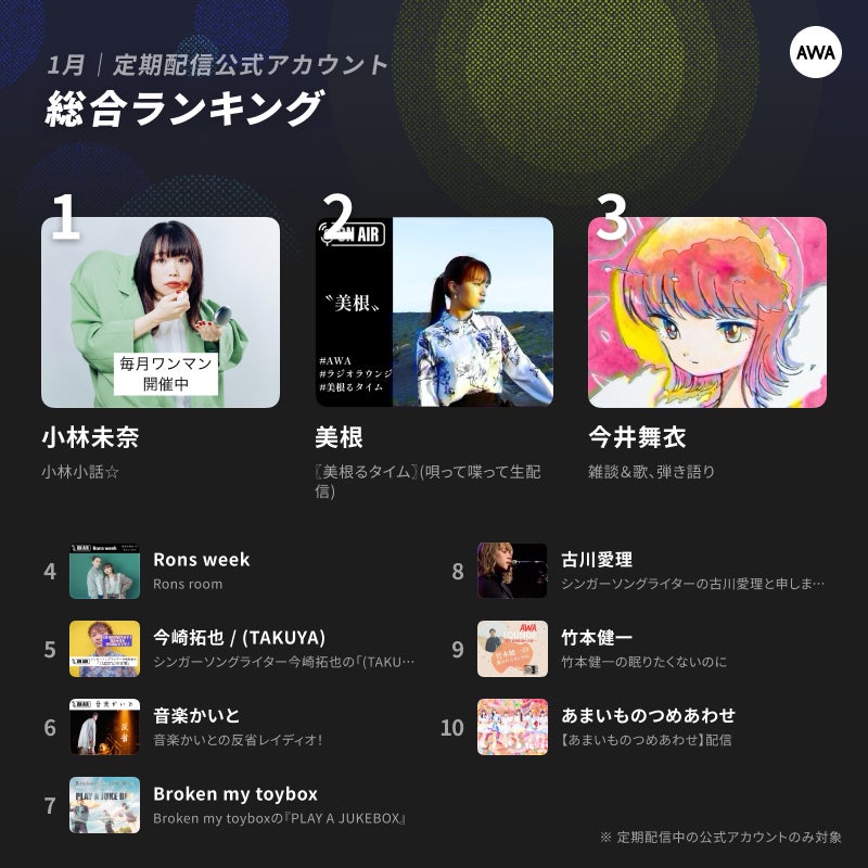 AWA株式会社(本社:東京都港区、代表取締役CEO:冨樫晃己)が運営する、サブスクリプション型(定額制)音楽ストリーミングサービス「AWA(アワ)」は、2025年1月1日(水)から1月31日(金)までに開催された、音声ライブ配信を利用した「定期配信ラウンジ」※の視聴数、開催頻度、リアクション数、フラワーチャット本数などを総合して、2025年1月の定期配信AWAラウンジランキングTOP10を発表いたしました。