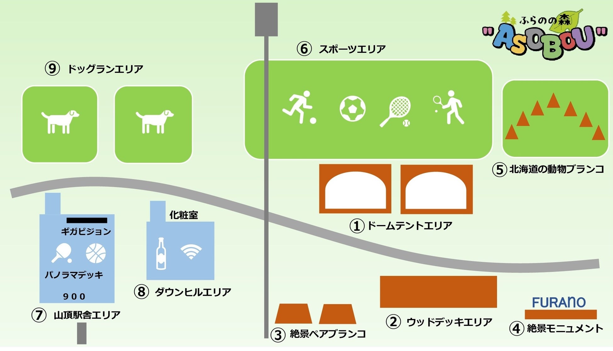 新たに誕生するスポット「ふらのの森“ASOBOU”」は、ファミリーやカップル、ワーケーションなど幅広くお楽しみいただける山頂の遊びスポットです。お子さまたちが安全に楽しめる玩具・エアコンなどを備えた40㎡のドーム型テント2基や全長10mのウッドデッキエリアでは絶景を望みながらリクライニングチェアーでゆっくりと読書なども楽しめます。また絶景ペアブランコや絶景モニュメントでは2人での世界観を演出しており、カップルやご友人でのご利用、ファミリーでもお楽しみいただけます。「FURANO」の文字を模したモニュメントがございますので、旅の思い出の撮影には最適です。スポーツエリアではサッカー、キャッチボール、バトミントン、山頂駅舎内ではバスケットボール、卓球なども楽しめます。隣接するダウンヒルエリアではWi-Fiが完備されており、ワーケーションや休憩スペースとしてもご利用いただけます。