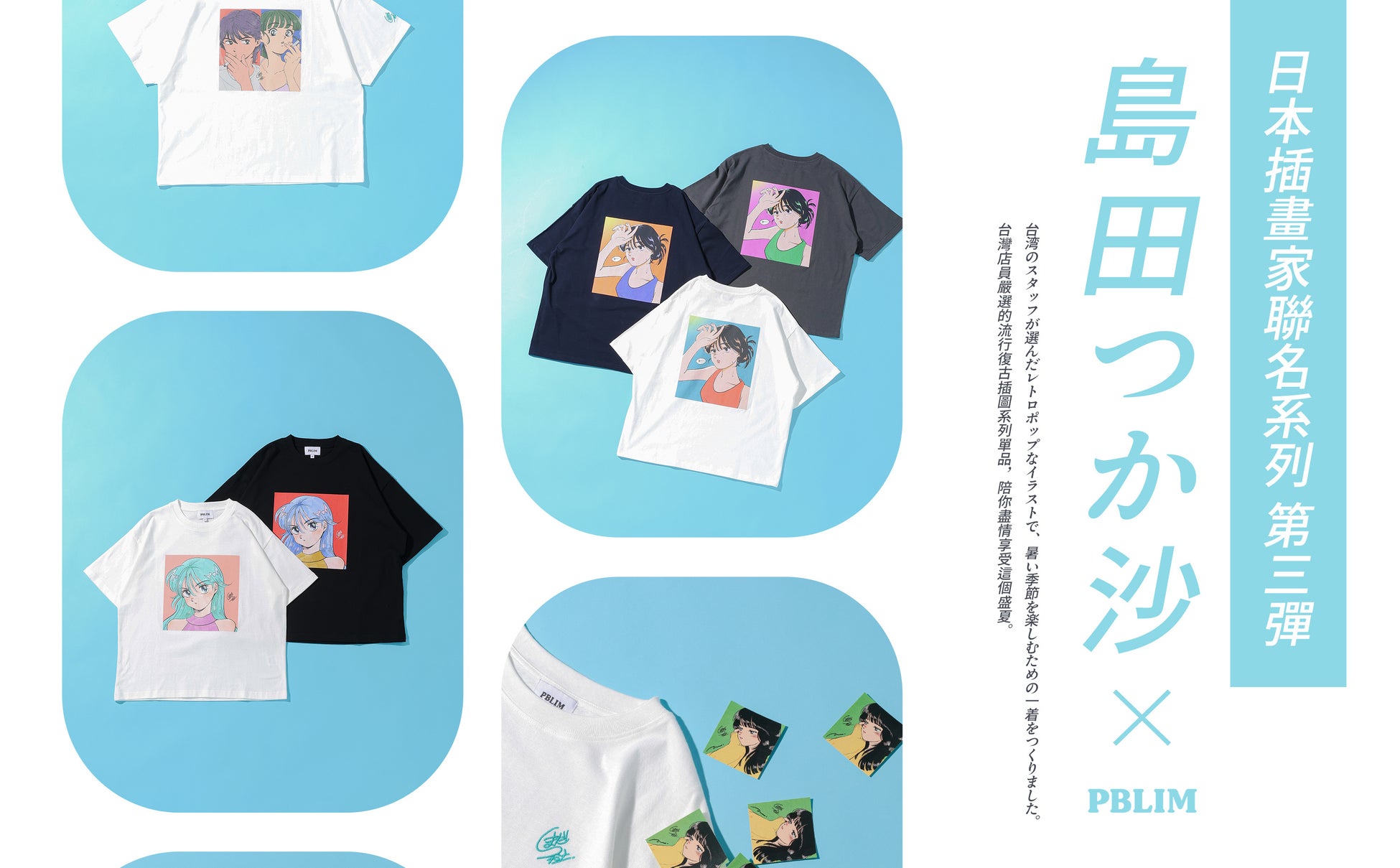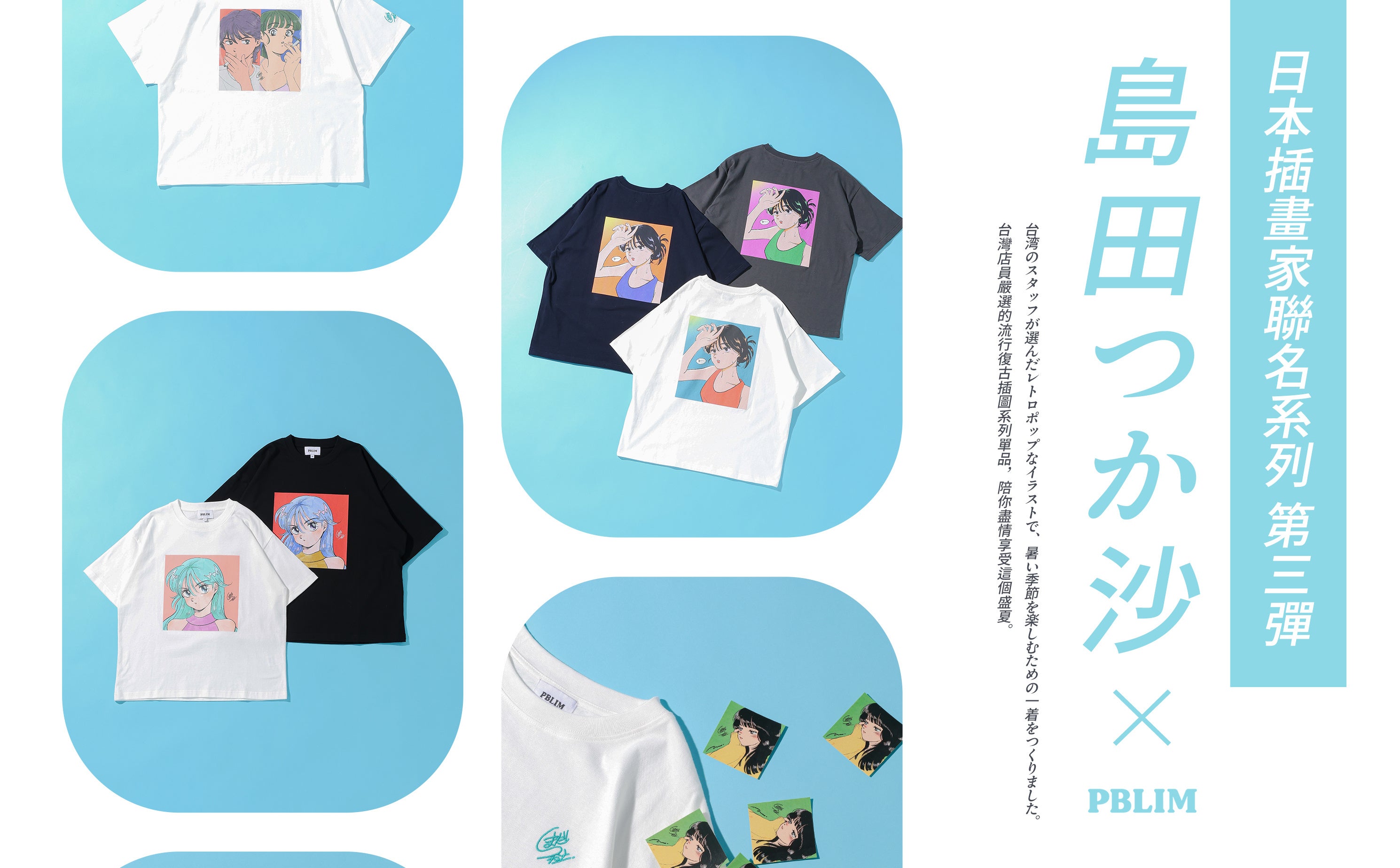 数ある島田つか沙氏の作品の中から、台湾スタッフが厳選したイラストをPBLIMオリジナルの限定カラーへとアップデートし、作品が持つレトロな空気感はそのままに、現代のストリートスタイルに馴染む配色を追求しました。イラストを飾るだけでなく「身に纏う楽しみ」を提案する、特別なコレクションに仕上がっています。