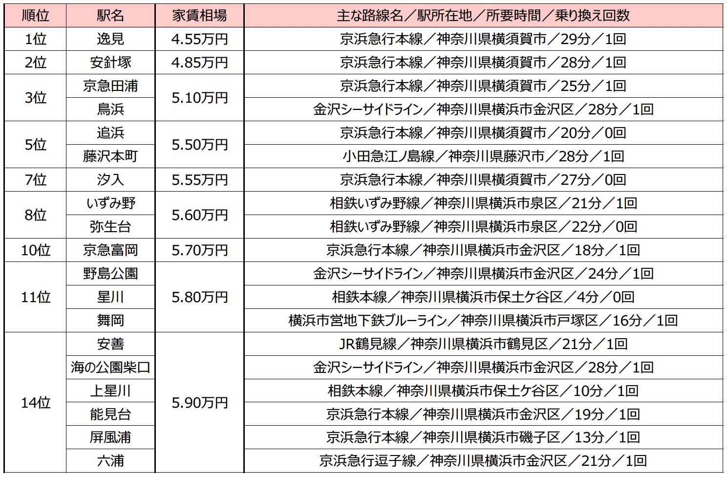 ここまで見てきたトップ3は1位が逸見駅で2位は安針塚駅、3位は京急田浦駅と、京浜急行本線で横浜駅に向かう順で連続する駅が名を連ねました。さらに5位・追浜駅(家賃相場5万5000円)、7位・汐入駅(同5万5500円)、10位・京急富岡駅(同5万7000円)と、トップ10のうち6駅もが京浜急行本線の沿線という結果になりました。