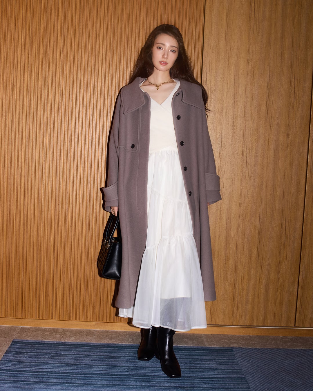 リブニットのトップスとシアーなオーガンジー素材を贅沢に使ったティアードスカートがドッキングになったワンピースに、FRAY I.Dの冬アウターとして絶大な人気を誇るウールリバー素材のコートを合わせて大人エレガントなスタイルに。
