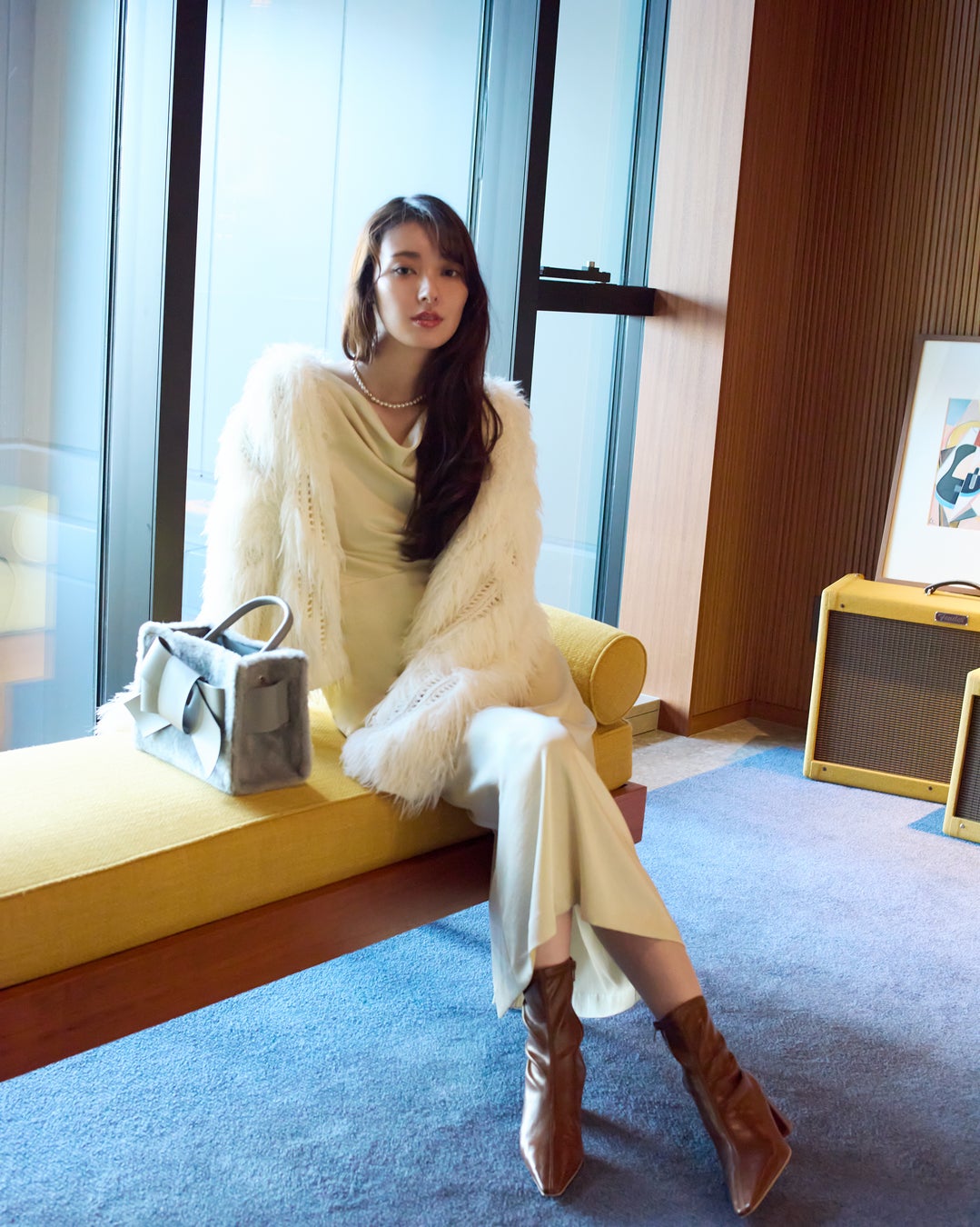 モヘヤとラメ糸が編み込まれたロング丈カーディガンとミニ丈ワンピースは、セットアップとしてはもちろん単体でも使えて冬に活躍するアイテム。ブークレー素材のストールをさらりと肩がけして、品のいい女性らしさをキープ。