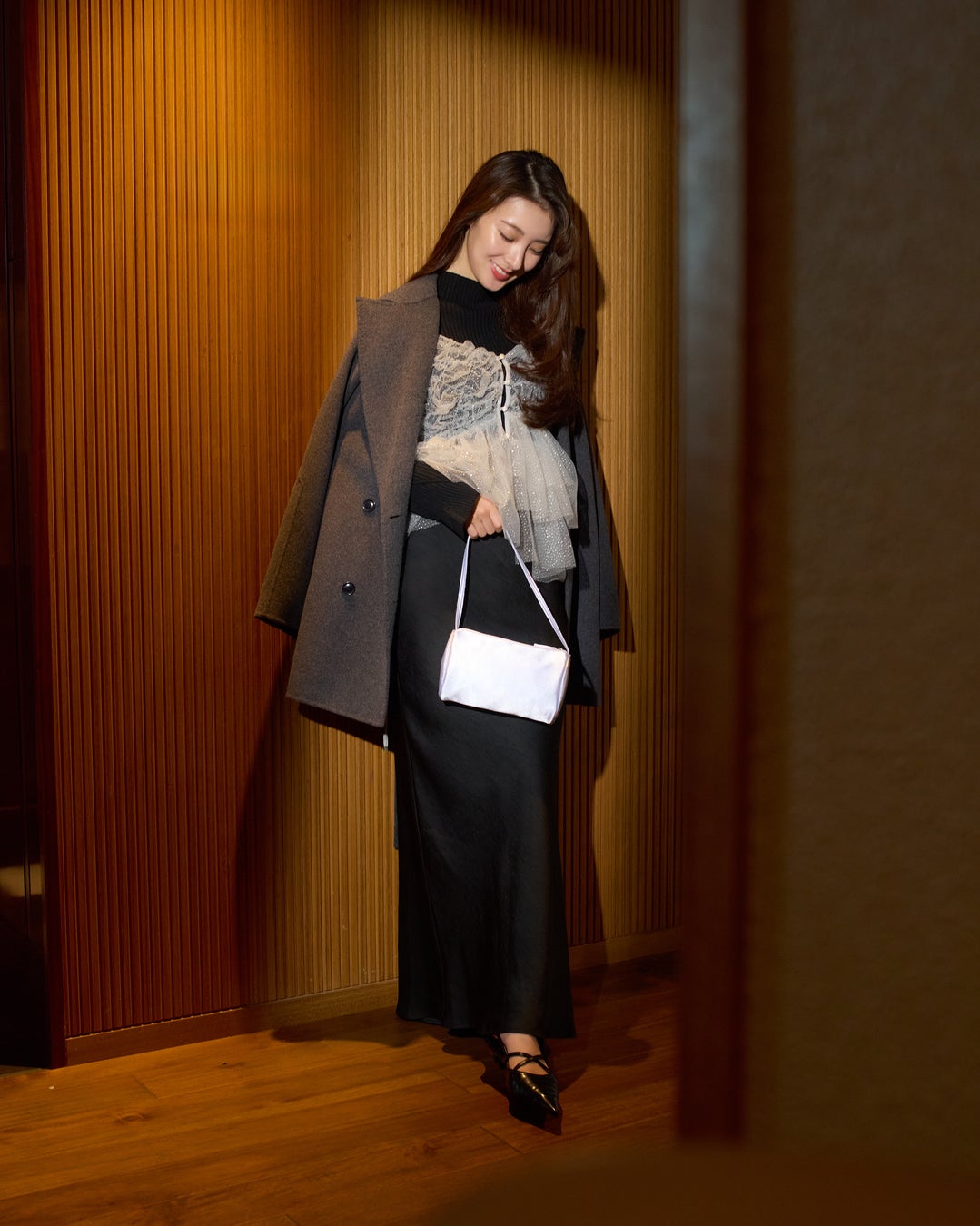 表情豊かなチュールが華やかな印象を演出する、ホリデー感満載コーデ。サテンのスカートとインナーのシルクリブニットはいずれもブラックをセレクトすることで、よりシックにまとまりクラシカルレディに。