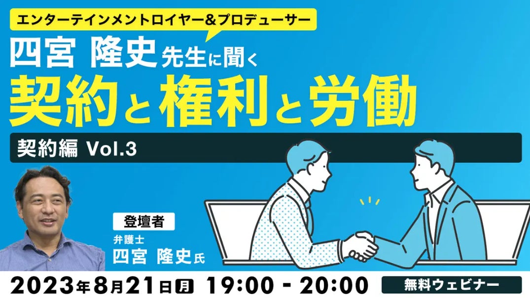【映像業界】TV・YouTubeなど、エンタメにまつわる法律を学ぶ 8/21(月)無料セミナー「四宮隆史先生に聞く 契約と権利と労働 ~契約編Vol.3~」