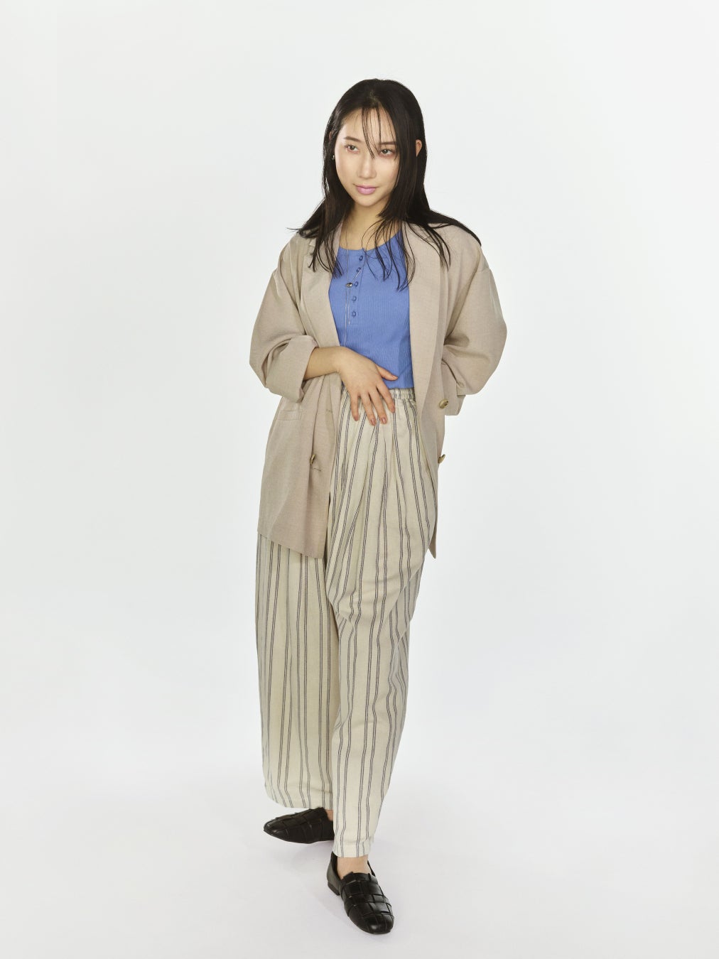 落ち着いたトーンのベージュのセットアップ風スタイルに、鮮やかなブルーのインナーを差し色として投入。柄物と異素材を組み合わせながらも、全体をクリーンにまとめた、洗練された着こなしです。