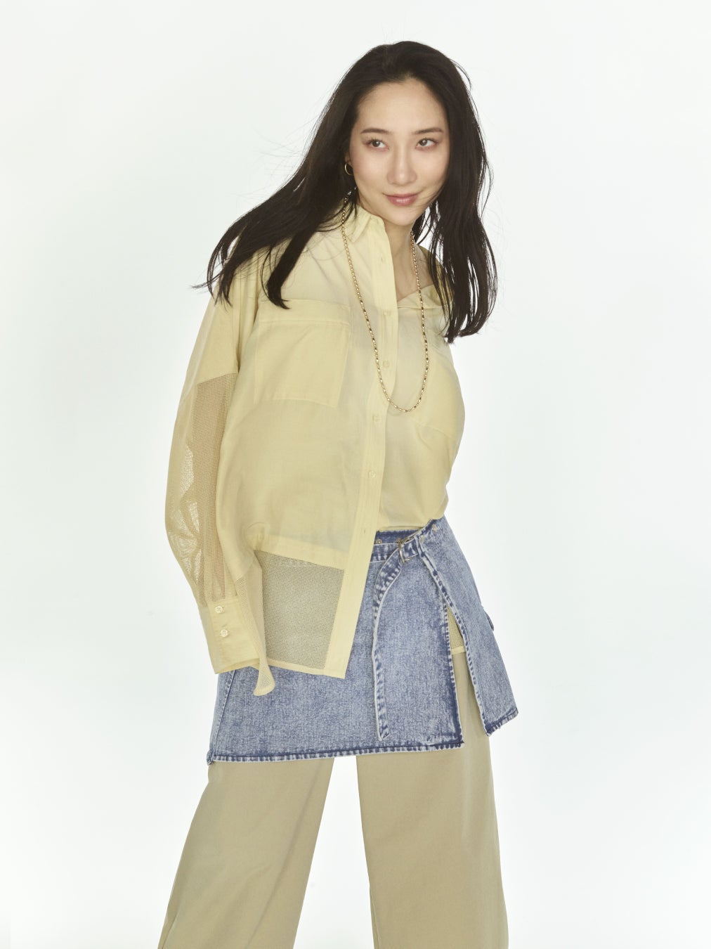 今シーズンのトレンドであるペールイエローをワントーンでまとめつつ、質感の異なるデニムアイテムを重ねることで、洗練された奥行きを生み出したスタイリング。