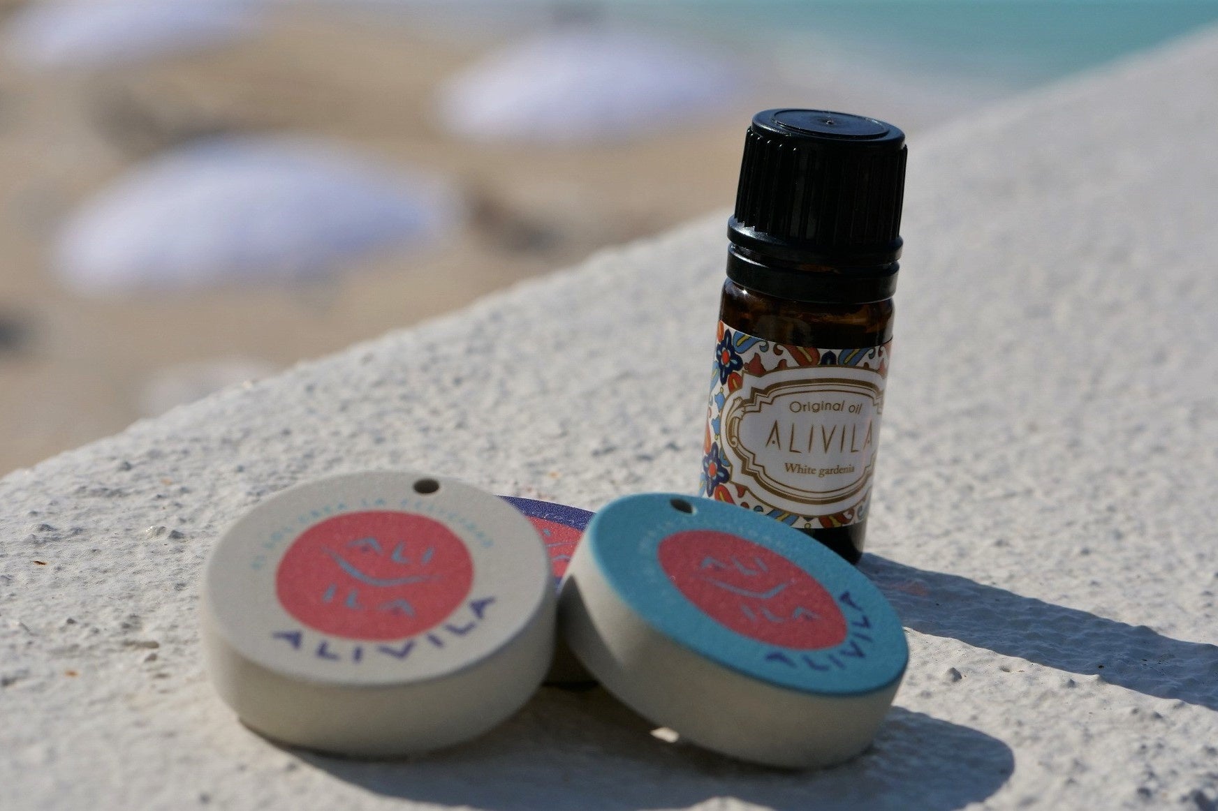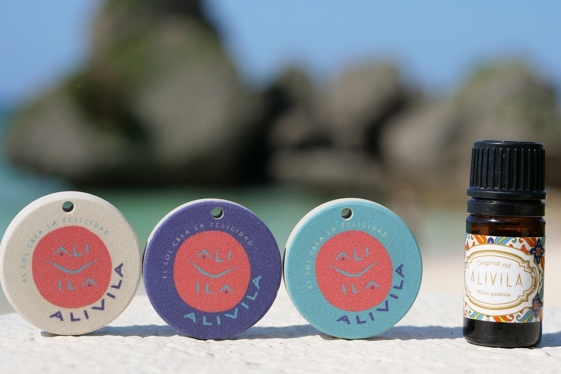 コンセントが不要となり玄関やオフィスのデスク周りのほか、眠るときに枕元に置いてお好きな香りをお楽しみいただけます。また、穴が開いているため紐を通し吊るして使用することも可能です。アリビラのロビーで使用しているホワイトガーデニアの香りのアロマオイルやお好みのアロマオイルを2~3滴染み込ませて香りをお楽しみください。