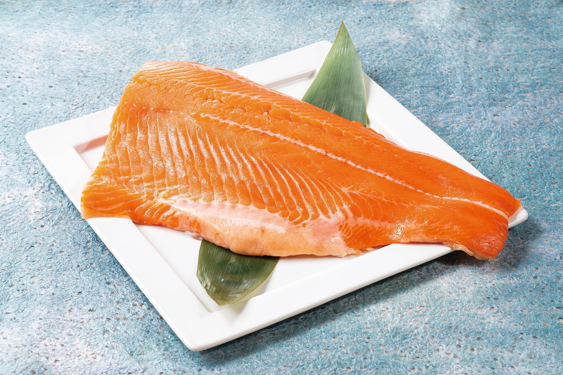 福井県で養殖されるトラウトサーモンは、水温20℃以下の低水温環境を活かして育てられ、きめ細かな脂とあっさりとした上質な味わいが特長です。