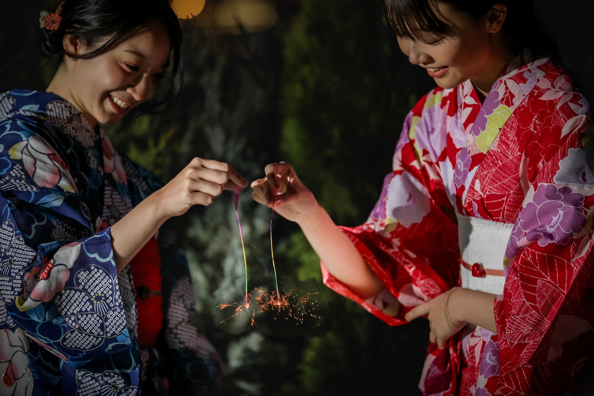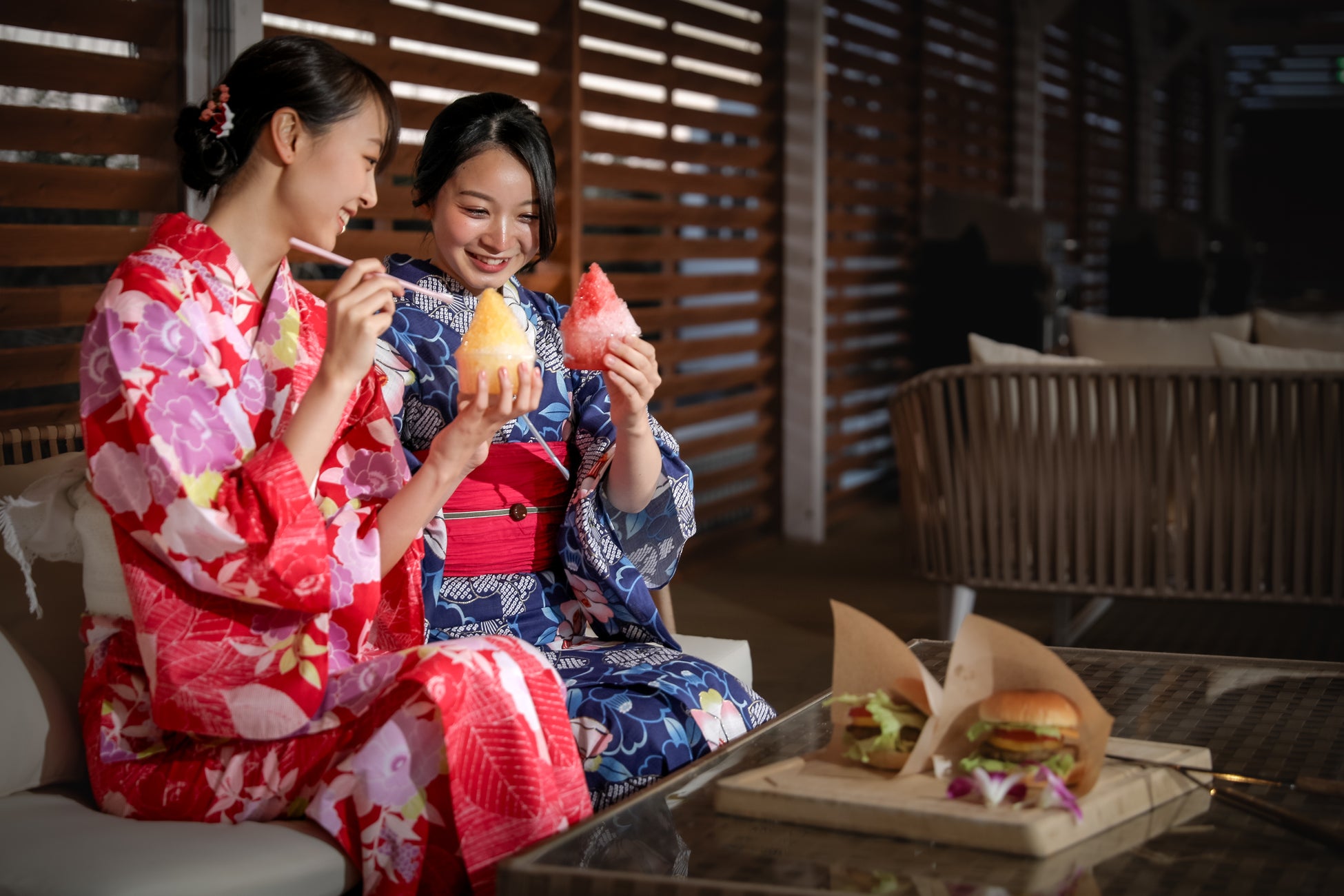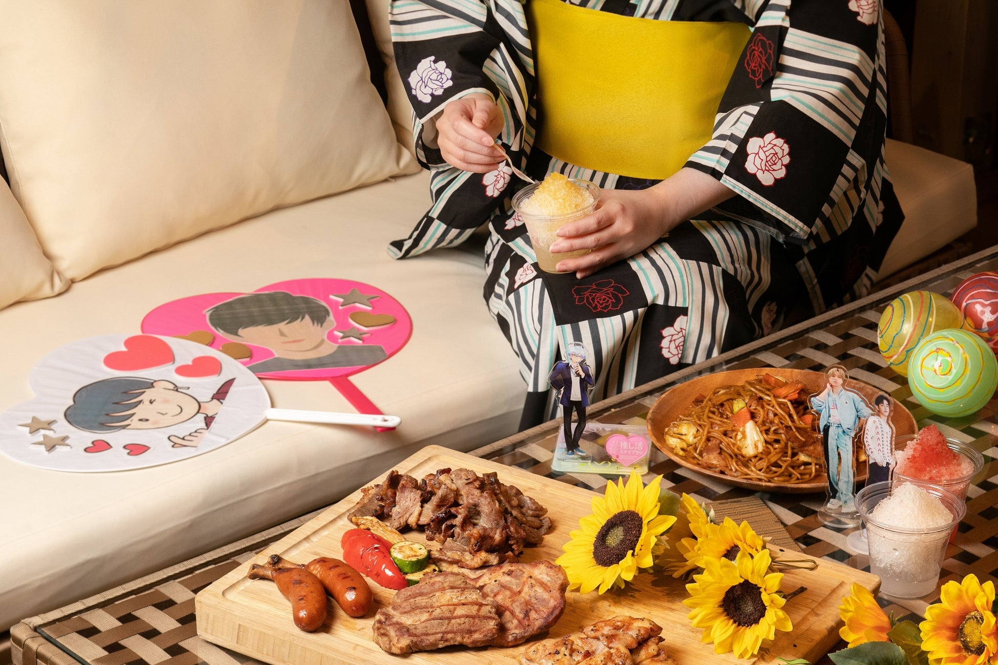 着付師による着付けが終わったら、夏の夜風が心地よいルーフトップで、漬け込み牛カルビや骨付きソーセージ、焼きそばなどのメニューをご堪能いただけるバーベキューをお楽しみいただきます。デザートには推し色のシロップをかけたかき氷をご用意。推し色に身を包んで、推し色かき氷をお召しあがりいただく、夏ならではの推し活をお楽しみください。また、ルーフトップでは足水や線香花火など、日本伝統の夏の風物詩もご体験いただけます。