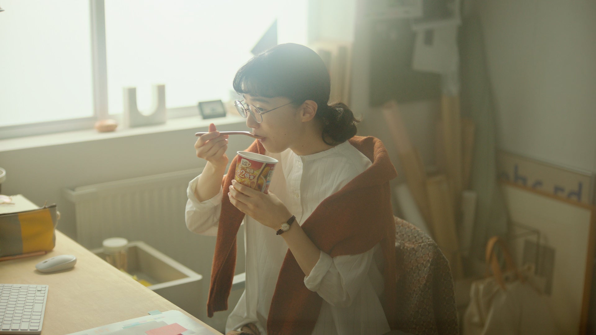 TVCMに登場するのは仕事で忙しい30代女性。慌ただしい生活や仕事の中、サクッと食べられるのに、香ばしくておいしいパンが2倍量入ったカップ入りスープで、こころもおなかも「超まんぞく」になれる。そんな、キーメッセージでもある「超いいコト盛りだくさん」な魅力を表現したTVCMです。