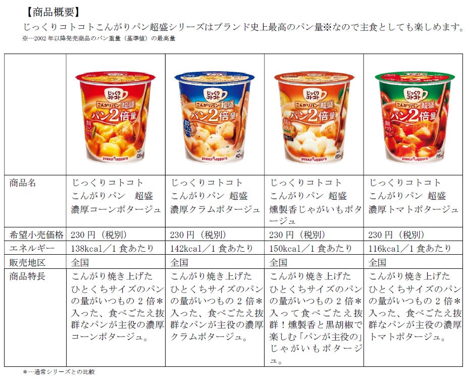 近年スープ市場は堅調に推移しており、カップ入りスープもコロナ禍以降のオフィス需要回復で堅調に推移しています(※1)。「じっくりコトコトこんがりパン」ブランドは、2002年の発売以来、素材が溶け込んだ濃厚スープを楽しめるカップ入りスープとして多くのお客様にご支持いただいています。昨年秋に新たに立ち上げた「じっくりコトコトこんがりパン 超盛」シリーズは、通常の「じっくりコトコトこんがりパン」の2倍量のパン(※2)が入っており、主な喫食シーンであるランチ需要に向けて主食代替にもなる食べごたえ抜群の商品です。パンが2倍量になっていることで、こんがり焼き上げたこだわりのパンが濃厚なスープにじゅわ~としみこんだ味わいとその満足感を存分にお楽しみいただけます。