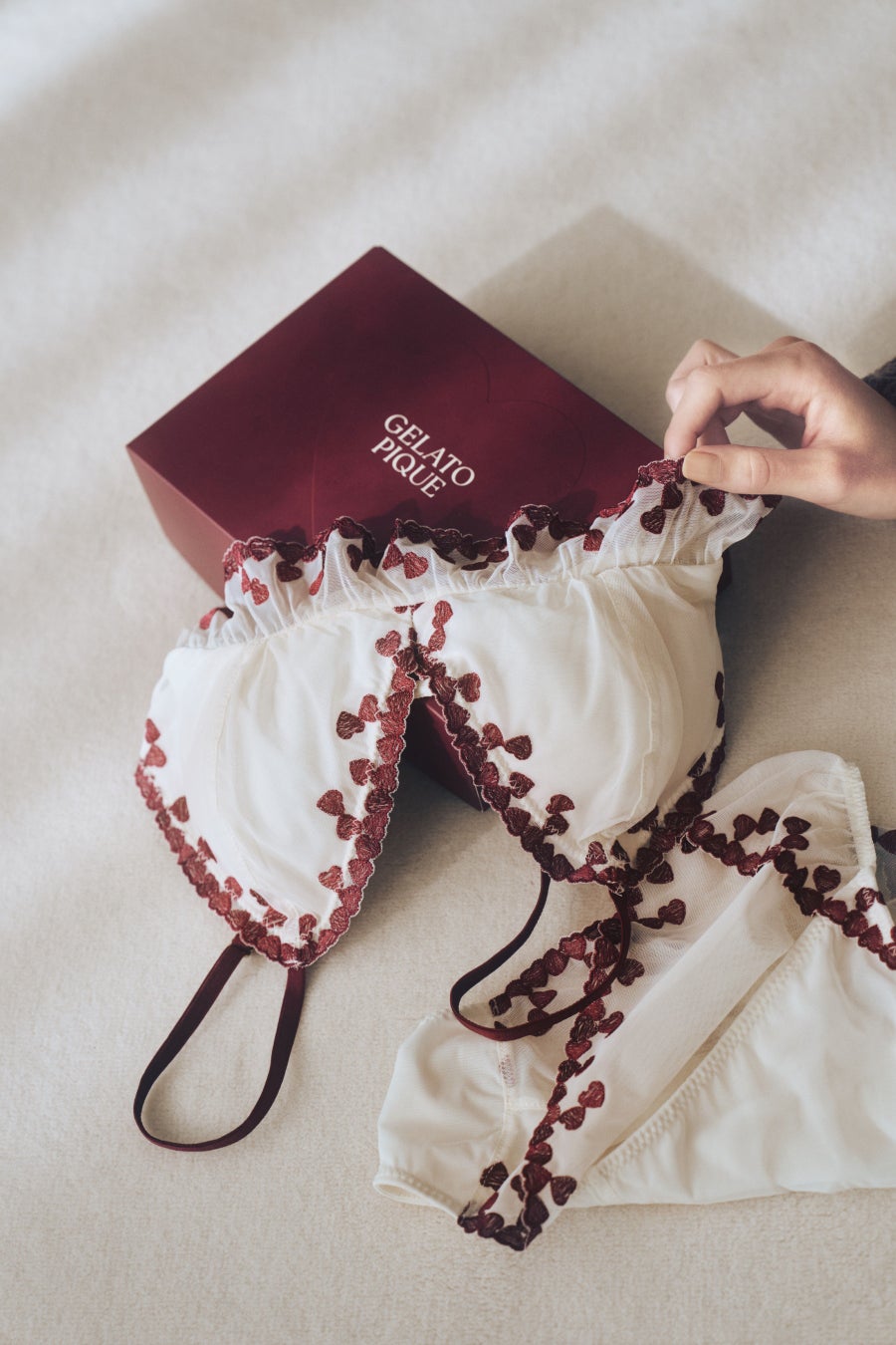 やわらかなチュール素材にハートの刺繍を施したブラ&ショーツセット。ボックスは、小物入れなどにもぴったりな特別感のあるデザイン。眺めているだけでも気分があがる繊細なディテール。