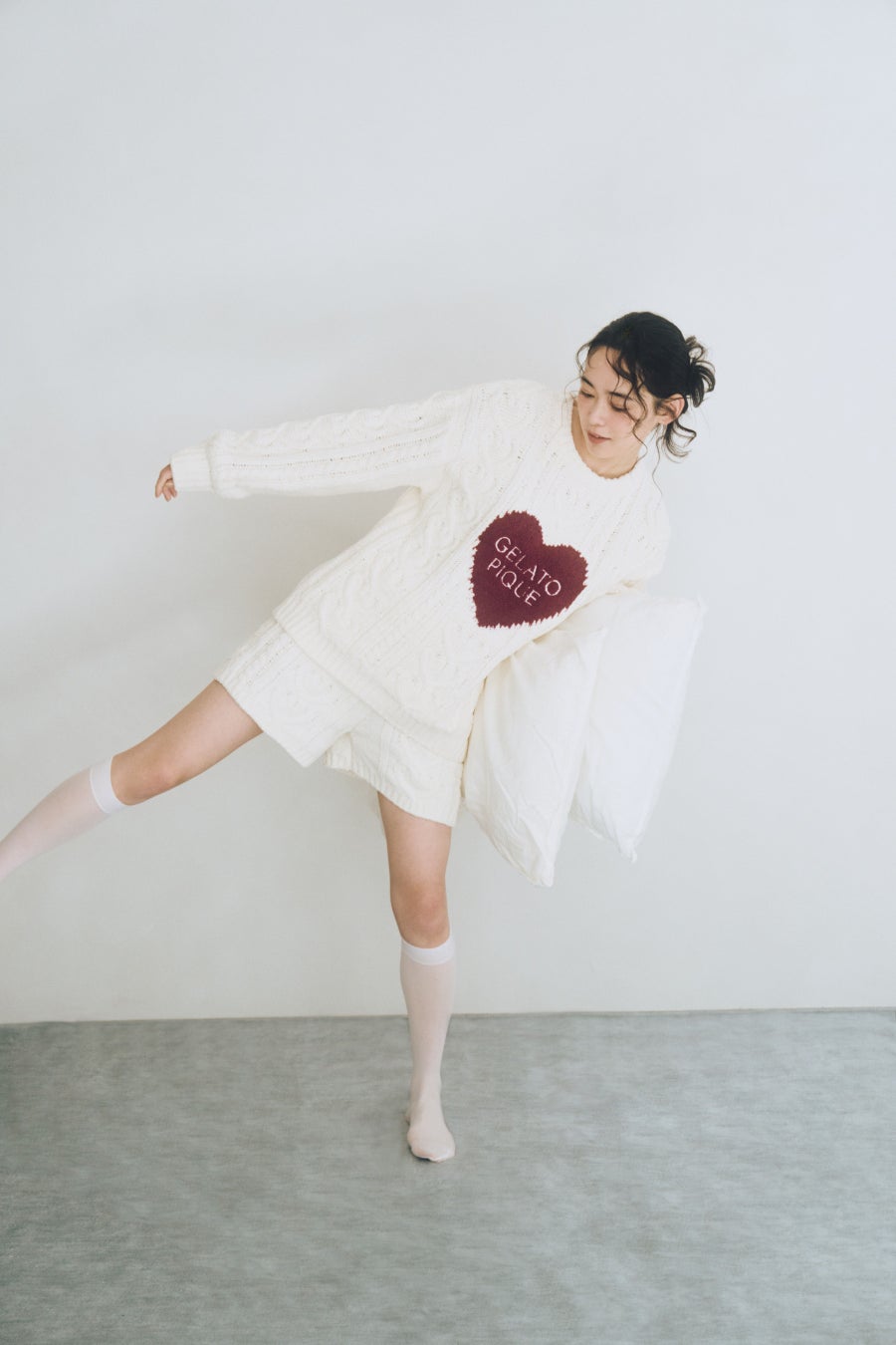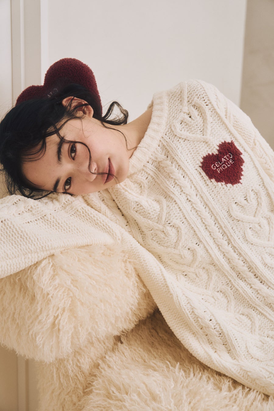 ハートを随所に散りばめた"HEART COLLECTION"。なめらかな肌触りに癒される‘スフレ’素材でハートのアラン柄を全面に編み、前身頃には大きなハートジャガードを入れたキャッチーなデザイン。おそろいのDOGウェアや雑貨も展開しています。
