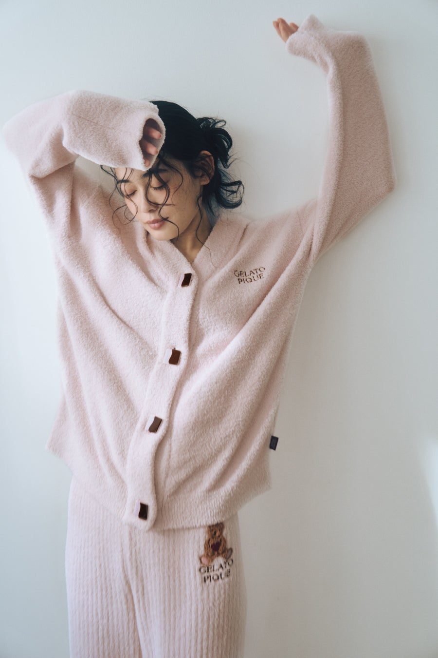 赤いハートを持ったベアジャガードがキャッチーなプルオーバーは、チョコレートカラーのブラウンとふんわりとした淡いピンクの2色展開。カーディガンは、チョコレートをイメージした美味しそうなボタンと、胸元のロゴ刺繍がポイントです。