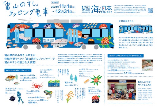 一般社団法人とやまミライラボは、富山のすしのおいしさのヒミツを学ぶ学習体験イベント「富山湾すしレンジャー」(7/25~27実施)に参加した県内の小学5・6年生20名がデザインを手掛けたラッピング電車を、2024年11月1日(金)から12月31日(火)までの2か月間、富山地方鉄道のご協力のもと運行します。運行開始を記念して、富山湾すしレンジャーたちが参加して電車の出発式を行います。