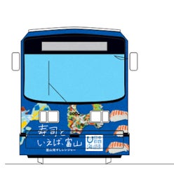 ラッピング電車の車両は「富山のすし」の面と「富山のすしを構成するもの」の面、それぞれ異なるデザインになっています。清涼な水、力強く育った米、富山湾の魚たち、そしてバラエティに富んだ富山のすしを表現しました。すしを入り口とした県のブランディング戦略、「寿司といえば、富山」の言葉が電車の前面と後面に書かれ、官民が連携して富山の寿司を盛り上げます。
