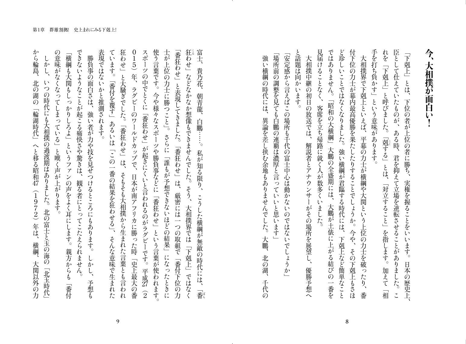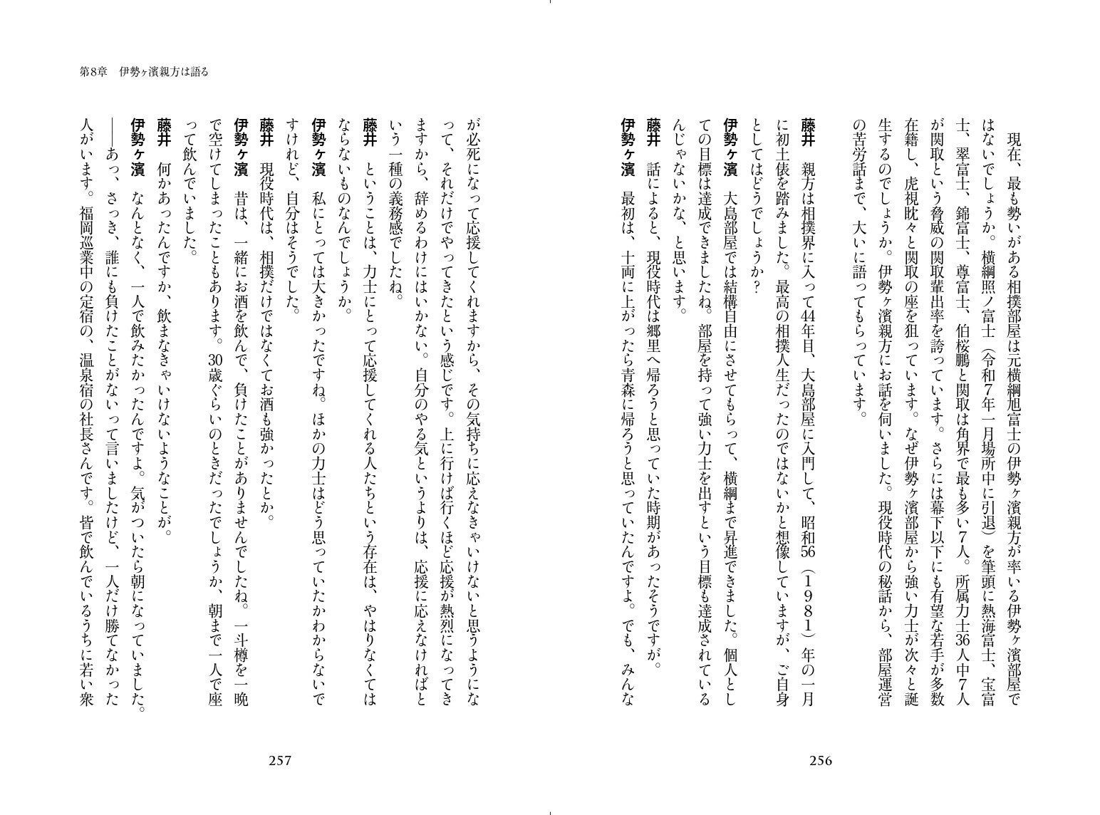 巻末では“今最も勢いがある相撲部屋”伊勢ヶ濱部屋の伊勢ヶ濱親方との対談も。親方の現役時代の裏話や、部屋を運営する上での苦労話などが満載。この一冊を読めば、大相撲中継を視聴するのがより楽しくなること間違いなし!