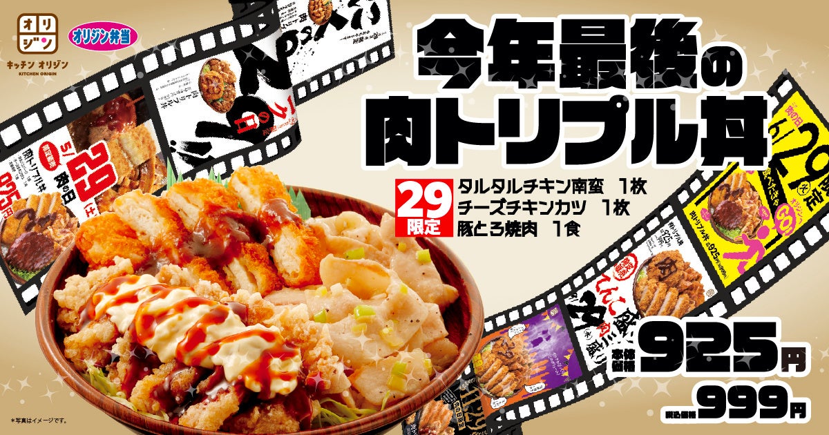 弁当・惣菜専門店「オリジン弁当」「キッチンオリジン」を展開しているイオングループのオリジン東秀株式会社(本社:東京都調布市/代表:沢村 弘也)は、2021年12月29日(水)10時より、「肉トリプル丼」を当日限定で販売いたします。