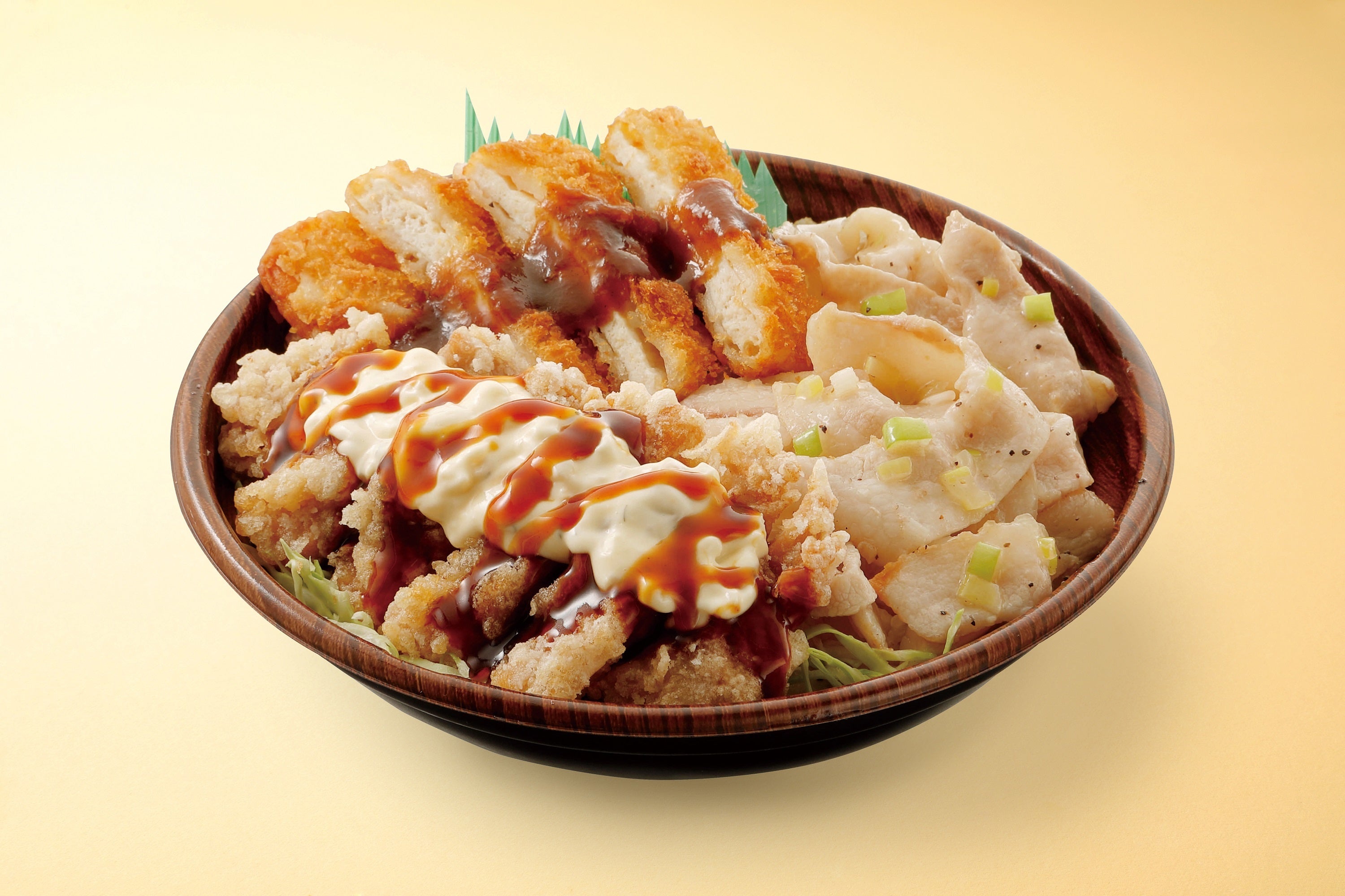 たっぷりタルタルがのったタルタルチキン南蛮に、サクッと軽い口あたりとほのかに感じるチーズが特徴のチーズチキンカツ、塩だれでさっぱり食べる豚とろ焼肉を丼にしました。