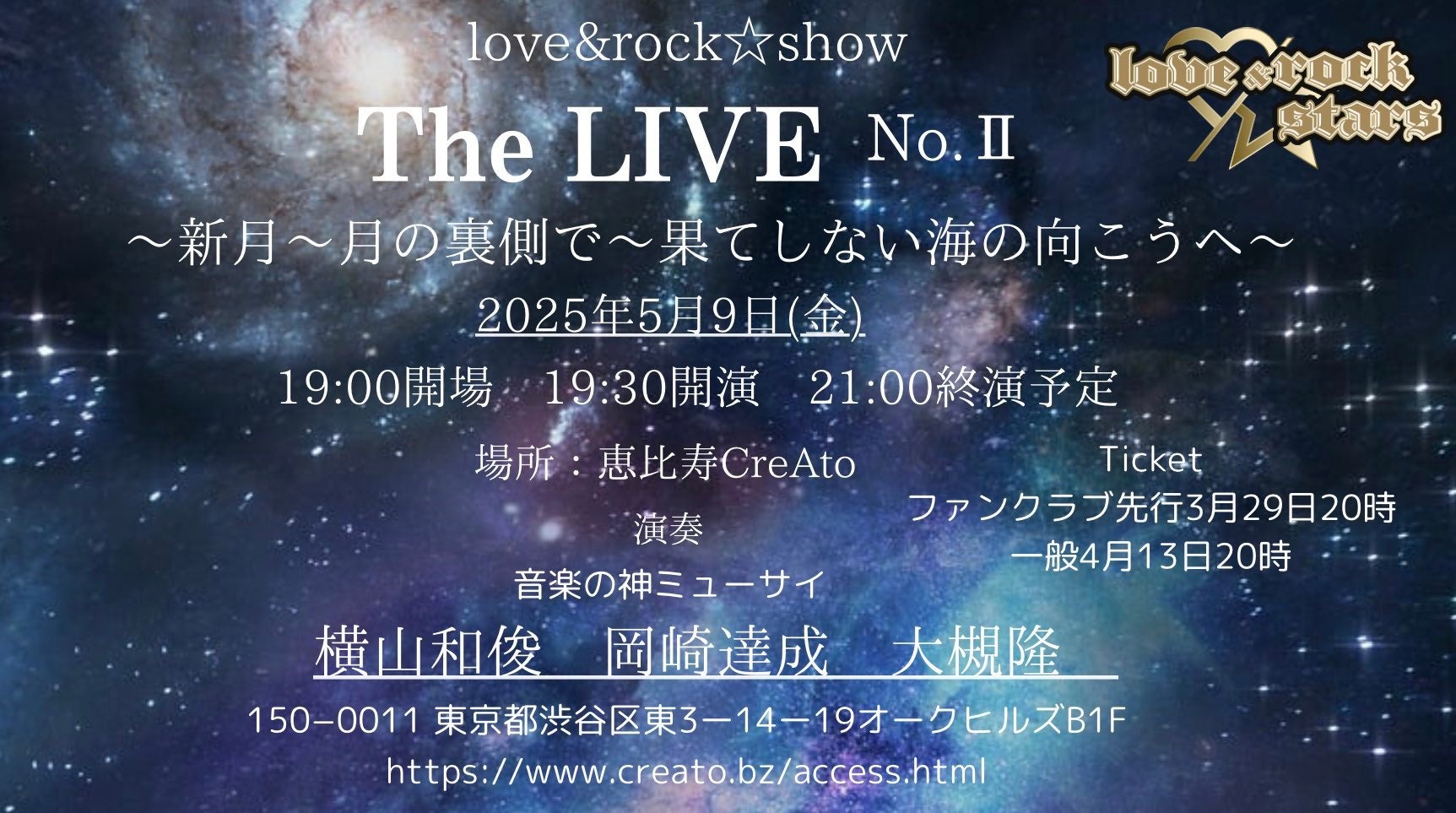 『love&rock☆show「The LIVE」No .II』が2025年5月9日 (金)に恵比寿CreAto(東京都 渋谷区 東 3丁目14-19)にて開催されます。
