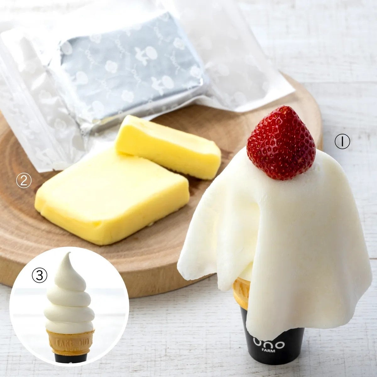 ①日高産いちごと名寄産もち米のスペシャルソフトクリーム