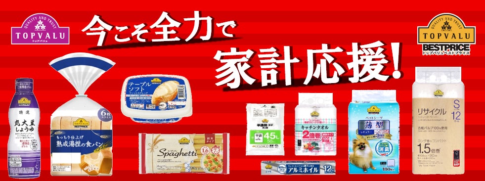イオンは、このような背景をふまえ、お客さまのくらしを応援するため、マヨネーズや小麦粉などの生活必需品を含む、トップバリュの食料品の価格(※1)を、年内据え置きから、2022年3月31日まで価格据え置き期間(※2)を延長します。さらに、多くのお客さまの支持とご要望にお応えし、トップバリュ食料品以外のトップバリュ日用消耗品(※3)(紙製品、家事消耗品等)も新たに加え、お客さまのくらしを全力で応援します。